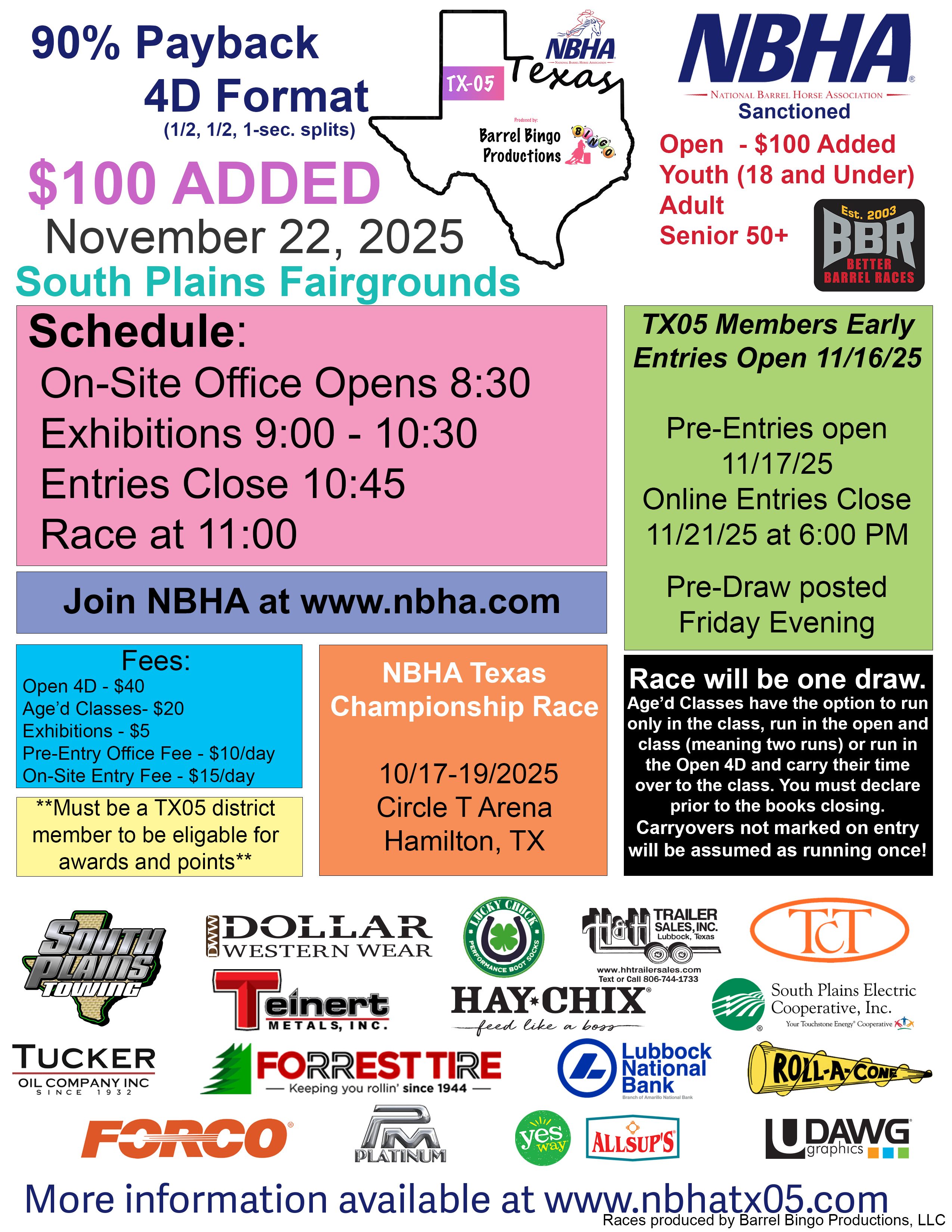 We are excited to be hosting NBHA races in the South Plains of Texas. All NBHA TX05 races are produced by Barrel Bingo Productions, LLC. They will include a 4D Open Race, Youth 4D Race, Senior 4D Race and an Adult 4D Race. All of the races will be 90% payback. Contestants must be an NBHA member to be eligible for Race Awards, District Points and year-end Awards.